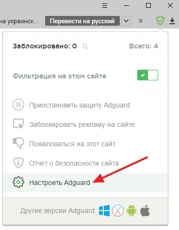 После этого появится всплывающее окно, в котором нужно выбрать раздел «Настройки Adguard» .